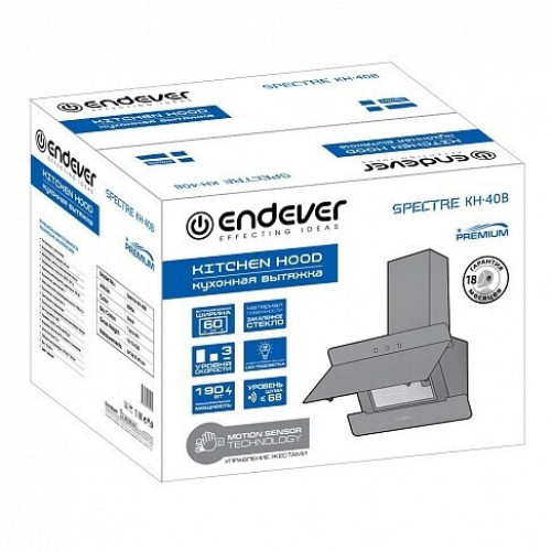 Кухонная вытяжка купольного типа ENDEVER Spectre KH-40B с функцией Motion SENSOR TECHNOLOGY(управление жестами). Стеклянная кухонная вытяжка с электронным управлением ENDEVER Spectre KH-40B - незаменимая деталь любой кухни, созданная с использованием современных технологий и разработок. Нет необходимости прикасаться к вытяжке, что бы включить её или увеличить мощность двигателя - Motion SENSOR TECHNOLOGY даёт возможность включения/выключения и регулировки мощности потока воздуха, легкими жестами руки. При необходимости, Вы можете воспользоваться встроенным сенсорным управлением. Индикация включения и текущий режим работы, отразятся на цифровом дисплее. Для подсветки рабочей зоны, применяются два встроенных LED светильника. Spectre KH-40B с легкостью справится с очисткой воздуха в любом помещении. Мощность двигателя составляет внушительные 190 Ватт, что в сочетании с применением периметрального всасывания, позволяет с легкостью прогонять до 700 кубических метров воздуха в час!