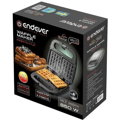 Электрическая вафельница Endever Skyline WM-22 – сэкономит ваше время и позволит быстро приготовить венские и бельгийские вафли, драники, творожные, сырные и овсяные вафли, яичницу, поджаривать бекон и многое другое. Высокая мощность электрического прибора 850 Вт позволяет моментально разогреть рабочую поверхность и затратить минимум времени на приготовление. Благодаря антипригарным пластинам, вафли подрумяниваются и не пригорают. О том, что пластины нагрелись и прибор готов к работе, сообщит световой индикатор на крышке вафельницы. Вафельницу можно хранить в вертикальном положении, так она будет компактна и займет совсем немного места на Вашей кухне. Благодаря термостойкому пластику, ненагревающиеся ручки и корпус позволяют использовать вафельницу без риска обжечься, а система защиты от перегрева исключает повреждение прибора. Также вафельница снабжена специальными ножками для устойчивости на поверхности. А для фиксации, на ручке предусмотрен специальный зажим-блокировка.