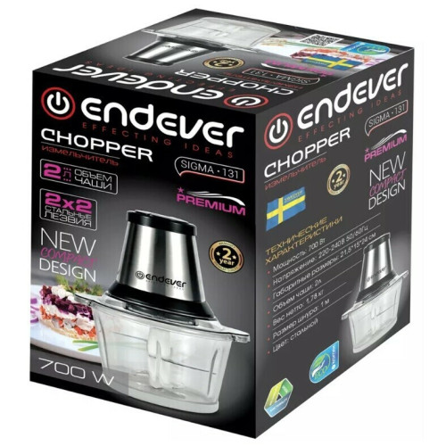 Новый измельчитель Endever Sigma-131 сочетает в себе мощность, надежность и удобство использования, чтобы сделать процесс еще более простым и эффективным. С мощностью в 700 Вт и объемом чаши в 2 литра, вы сможете быстро измельчить различные продукты. Двойные лезвия и ручка из нержавеющей стали обеспечивают превосходную прочность и долговечность. Высокопрочная чаша из ЭКО-стекла не только надежна, но и безопасна для использования с пищевыми продуктами. Противоскользящая подставка обеспечивает стабильность и безопасность при работе с измельчителем. Измельчитель Sigma-131 обладает двумя скоростями работы, позволяя вам выбирать оптимальный режим для обработки различных продуктов. Благодаря герметичной защите от брызг, ваша кухня останется в чистоте. Не упускайте возможность упростить готовку и сделать процесс более удобным с новым измельчителем Endever Sigma-131.