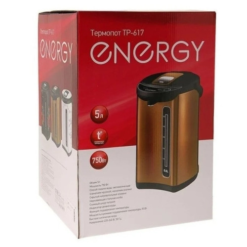 Термопот Energy 5 л 750 TP-617 280305 Объем: 5 л Мощность: 750 Мощность в режиме поддержания температуры: 35 Напряжение: 220-240 В Функция блокировки крышки Быстрое кипячение воды Способ подачи воды: автоматический (нажатием кружкой, нажатием кнопки) Скрытый нагревательный элемент Нержавеющая стальная колба Съемный шнур питания Индикатор уровня воды Функция поддержания температуры