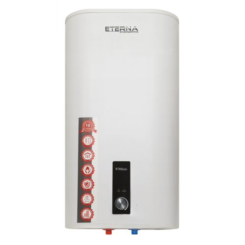 Электрический водонагреватель ETERNA (ЭТЕРНА) FS-80D - это надежное оборудование, которое будет полезно для семьи из 3-4 человек. Прибор необходим в квартирах или домах с отсутствующим ГВС или при его периодическом отключении. Устройство оснащено резервуаром из нержавеющей стали, объем которого составляет 80 литров. Особенности и преимущества: * Плоский корпус с двумя внутренними баками * Запатентованная технология удаления воздуха из обоих баков обеспечивает защиту сварных швов от коррозии * Сухой ТЭН * Универсальный монтаж * Максимальное давление в системе ГВС 7 бар * Эффективная теплоизоляция позволяющая долго сохранять воду нагретой * Механическое управление * Баки из нержавеющей стали * Степень защиты - IPX4 Электрические водонагреватели от компании ETERNA серии FS-D представлены 4 моделями, объем которых составляет 30, 50, 80 и 100 литров. Оборудование представлено в плоском корпусе и оснащено двумя резервуарами. Оборудование оснащено механическим управлением и долговечными ТЭНами сухого типа.