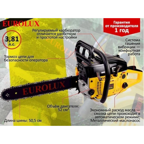 Бензопила Eurolux GS 5220 - для частного применения. Отлично подойдёт для валки небольших деревьев, обрезки сучьев, ухода за садовыми культурами. Особенности бензопилы Eurolux GS 5220: - сниженная вибрация - тормоз цепи - обеспечивает безопасность оператора - автоматическая смазка цепи в процессе работы - эргономичный дизайн - относительно малый вес - специальные накладки на рукоять для обеспечения надёжного хвата