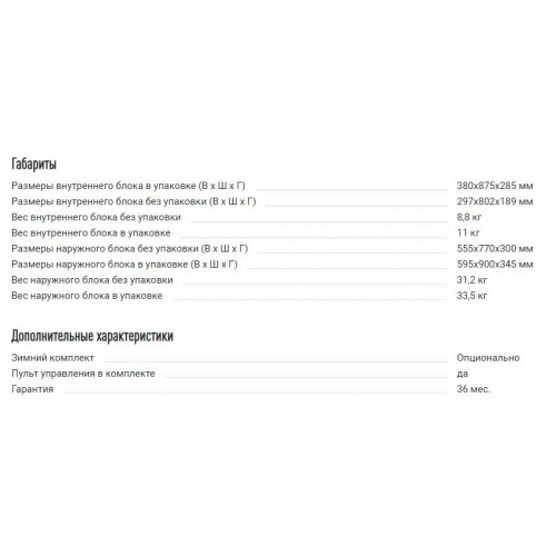 обогрев и охлаждение помещений до 35м² режим вентиляции, поддержания температуры, ночной, осушения воздуха дезодорирующий фильтр, фильтр тонкой очистки мощность охлаждения 3520 Вт / обогрева 3810 Вт управление с пульта энергоэффективность A класса уровень шума внутреннего блока 26.5 дБ - 37.5 дБ тип дисплея: скрытый