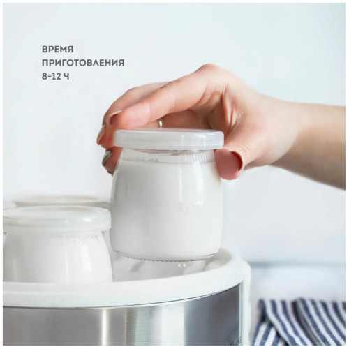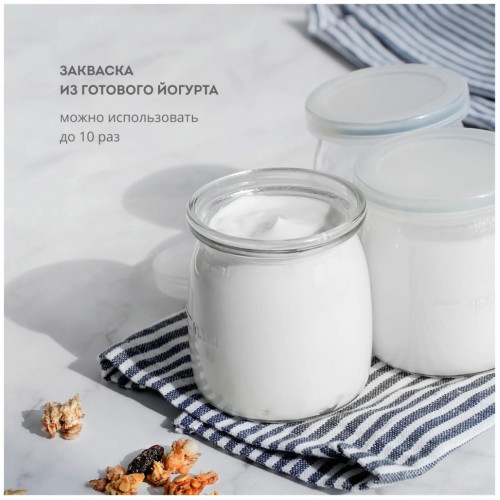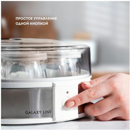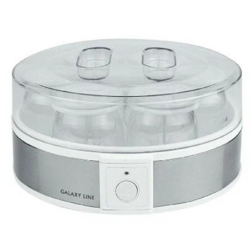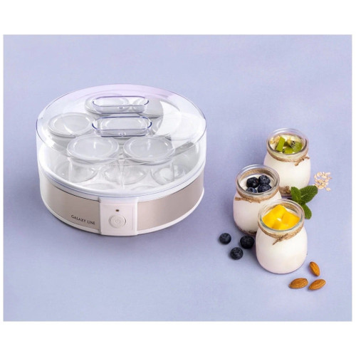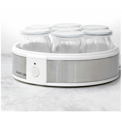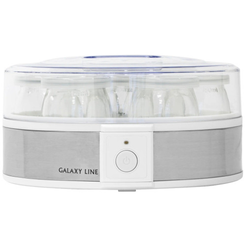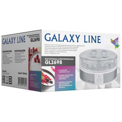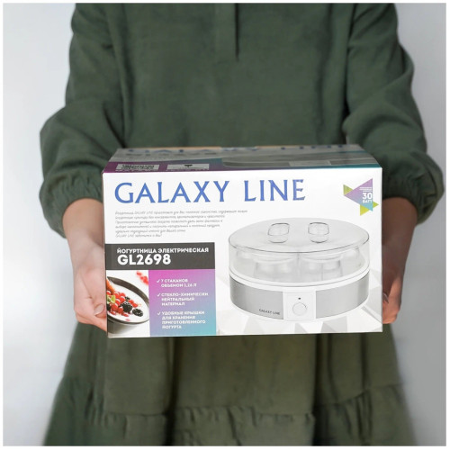 Электрическая йогуртница GALAXY LINE GL2698 позволяет готовить полезный и вкусный натуральный кисломолочный продукт в домашних условиях. Йогурт очень полезен для пищеварительного тракта, но только натуральный и правильно приготовленный. Йогуртница GL2698 имеет 7 специальных стеклянных стаканчиков с крышками, в которых и готовится натуральный йогурт. При переливании из одной емкости в другую полезные бактерии погибают и йогурт теряет свои лечебные свойства, поэтому приготовление и хранение йогурта в отдельных стаканчиках - наилучший способ. Стекло - химически нейтральный материал и не меняет вкус, запах и пользу готового продукта, в отличие от пластика. Объем каждого стеклянного стаканчика 180 мл, общий объем готового продукта в йогуртнице GL2698 составляет 1,26 л. Для приготовления йогурта следует использовать сухое или пастеризованное молоко. Рекомендуется выбирать молоко с большим процентом жирности. В качестве закваски можно использовать сухую йогуртовую закваску, либо «живой» йогурт, приготовленный без термической обработки. Специальные лечебные бактерии для йогурта можно приобрести в аптеке. Для сохранения всех полезных свойств йогурта рекомендуемое время приготовления составляет 8-12 часов. Данная модель имеет низкое энергопотребление. По истечении времени приготовления, необходимо поместить стаканчики на 2-3 часа в холодильник до загустения йогуртовой массы. По желанию перед употреблением в йогурт можно добавить сахар, кусочки фруктов, ягоды, джем, злаки и пр. Готовый йогурт впоследствии можно использовать в качестве закваски до 10 раз. При этом время приготовления следующей партии будет составлять 6-7 часов. Готовьте с пользой и удовольствием с техникой GALAXY LINE!