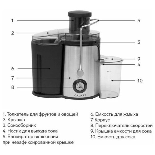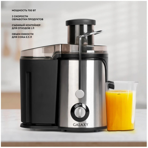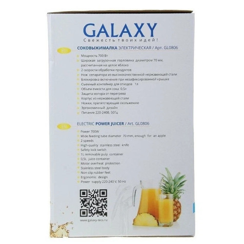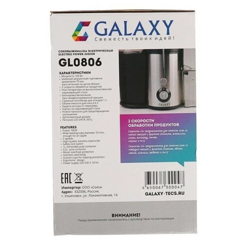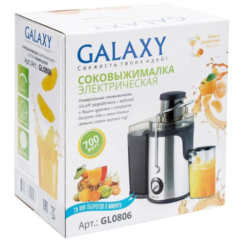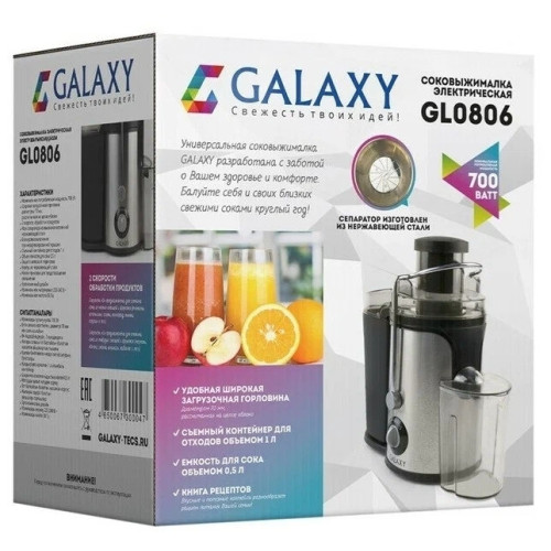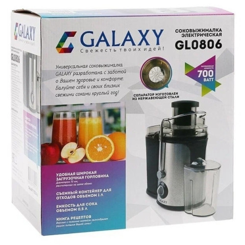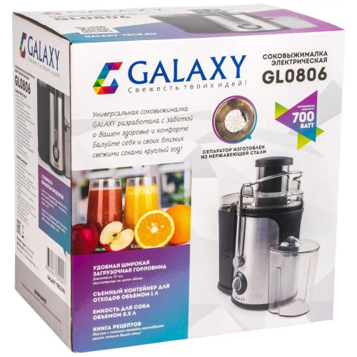 Соковыжималка GALAXY GL0806 имеет стильный дизайн в корпусе из нержавеющей стали и разработана из экологически безопасных материалов. Модель GALAXY GL0806 центробежного типа, поэтому имеет высокую скорость отжима и проста в использовании, а надежный мотор гарантирует высокую производительность данной модели! Выгодным преимуществом соковыжималки GL0806 является широкая загрузочная горловина диаметром 70 мм, две скорости обработки продуктов и нож сепаратора из высококачественной нержавеющей стали. Первая скорость предназначена для отжима сока из мягких овощей и фруктов (томаты, апельсины, сливы, виноград, тыква, огурцы и пр) Вторая скорость предназначена для отжима сока из твердых овощей и фруктов (морковь, яблоки, свекла, ананасы, кабачки и пр) Эргономика прибора выражена наличием ножек-присосок, препятствующих скольжению. Дополнительный бонус для любителей соков и напитков - книга рецептов в комплекте к соковыжималке GALAXY GL0806.