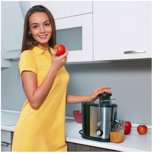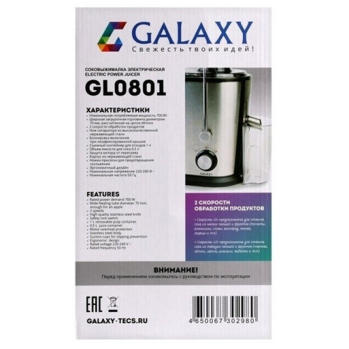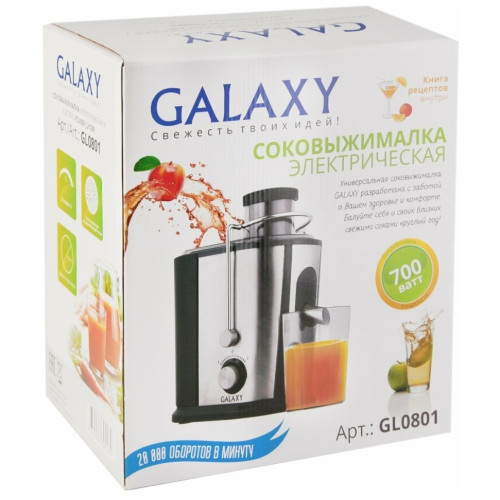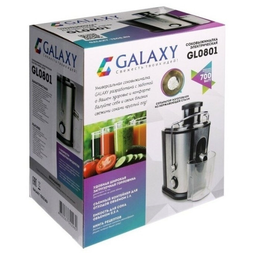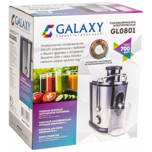 Соковыжималка GALAXY GL0801 разработана из экологически безопасных материалов. Модель GALAXY GL0801 центробежного типа, поэтому имеет высокую скорость отжима и проста в использовании, а надежный мотор гарантирует высокую производительность данной модели! Выгодным преимуществом соковыжималки GL0801 является широкая загрузочная горловина диаметром 70 мм, две скорости обработки продуктов и нож сепаратора из высококачественной нержавеющей стали. Корпус соковыжималки выполнен из нержавеющей стали. Эргономика прибора выражена наличием ножек-присосок, препятствующих скольжению. Дополнительный бонус для любителей соков и напитков - книга рецептов в комплекте к соковыжималке GALAXY GL0801