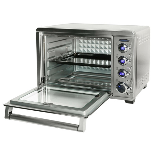Электрическая конвекционная печь Gemlux GL-OR-1538LUX с объемом рабочей камеры 38 л отличается компактными размерами, небольшим весом и может быть с успехом использована как полноценная замена электрической духовке и кухне городской квартиры, и в загородном доме. Оборудование имеет прочный и гигиеничный корпус из нержавеющей стали и оригинальное электронное управление. Режим работы, температура верхнего и нижнего нагревательных элементов и время приготовления задаются вращением четырех ручек оригинальной асимметричной формы, расположенных на панели управления справа от дверцы. Заданные значения параметров выводятся на четыре ЖК-дисплея, которые производитель разместил на тех же ручках. Выглядит это весьма эффектно и необычно.