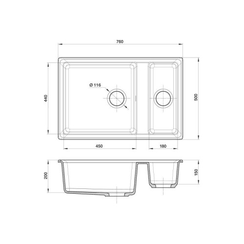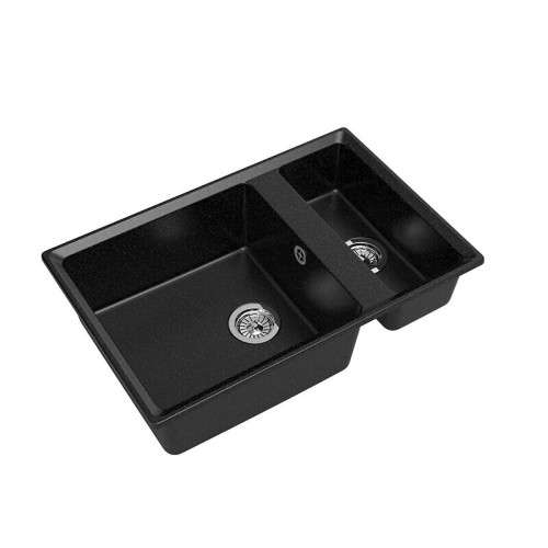 Кухонная мойка GranFest GF-LV-760K черный Общий размер: 760x500x200 мм Размер чаши: 450x440x200, 180x440x150 мм Тип монтажа: классический врезной Установочный проем: 740x480 мм Материал: мраморный композит Комплектация: сливная арматура