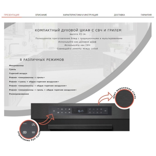 Компактный встраиваемый духовой шкаф С СВЧ И грилем GRAUDE PREMIUM BWG 45.0 SE Полностью сенсорное управление Деликатная разморозка Встроенная СВЧ Изготовитель - Германия Габариты, Ш*В*Г - 594*455*536 мм общие данные Полезный объем: 38 л Режимы работы: соло + гриль + конвекция Мощность микроволны: 1000 Вт Цвет: черное стекло режимы работы подробнее: Микроволновый режим Гриль Конвекция Гриль + конвекция Размораживание Микроволны + гриль Микроволны + конвекция Микроволны + размораживание (оттаивание по времени) Количество автоматических программ приготовления: 8 управление И функции Сенсорное управление Easy Control LCD-дисплей Установка длительности приготовления Цифровые часы с таймером автоматического отключения Режим Power Cook Режим Quick Cook Температурный зонд безопасность Блокировка дверцы Дверца с 3х-слойным остеклением Защита от детей дополнительная информация Рабочая камера из нержавеющей стали Комплектация: противень для выпекания, решетка для жарки Вращающаяся тарелка/автоматика отключения Диаметр вращающейся тарелки: 315 мм Освещение