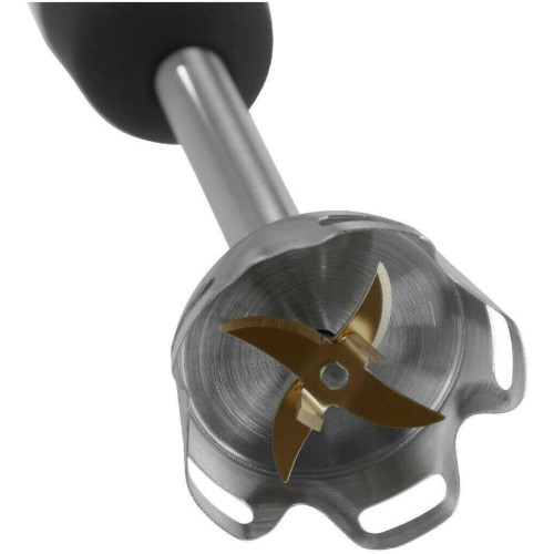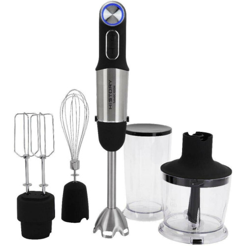 Многофункциональный прибор 4 в 1 History IHB-527 блендер, венчик, измельчитель, миксер. Мощный 1000 Вт DC TURBO мотор и 6-ти конечный нож с титановым покрытием. * Плавная ручная регулировка скорости оборотов с голубой LED подсветкой (до 20 скоростей) * Специальная форма конуса насадки-блендера с отверстиями для минимизации брызг * Стакан для смешивания с крышкой для последующего хранения готового продукта * Низкий уровень шума * Надежная фиксация насадок боковыми кнопками * Премиальная отделка комплектующих Soft-Touch (нескользящее черное покрытие) * Двойная защита от перегрева и перегрузки * Все насадки (кроме электрического моторного блока и покрытий Soft Touch) можно мыть в посудомоечной машине