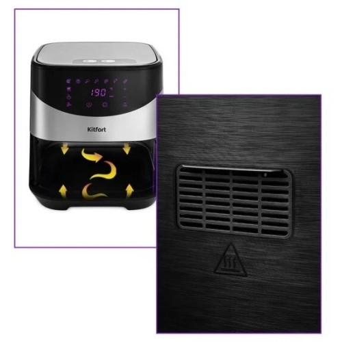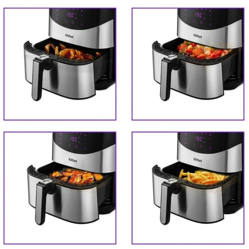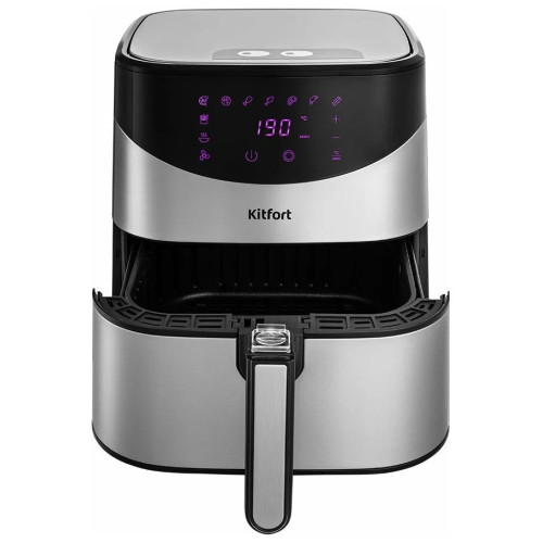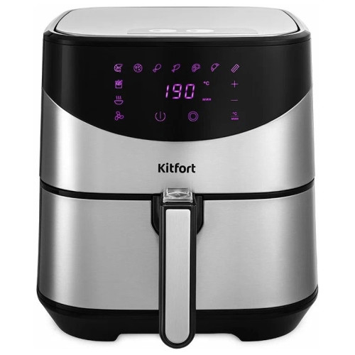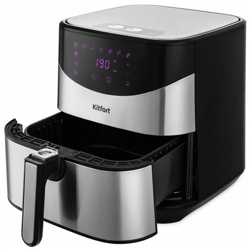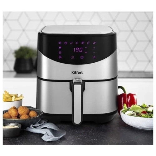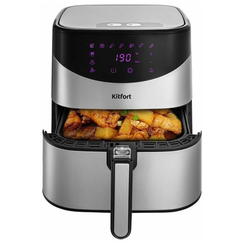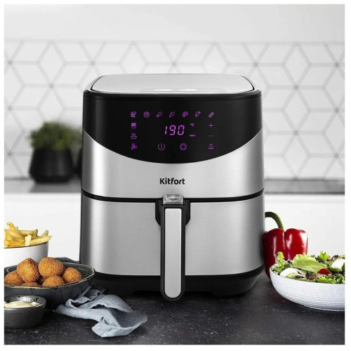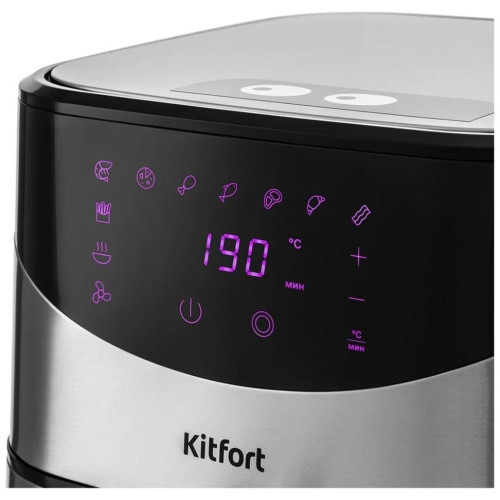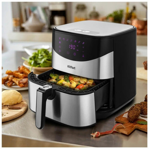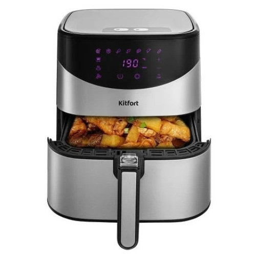 Аэрогриль Kitfort КТ-2231 Современный аэрогриль Kitfort КТ-2231 интересен не только стильным дизайном: он может использоваться как аэрогриль, а также как аэрофритюрница и духовка. Для приготовления продуктов в аэрогриле не нужно масло, а если хочется его добавить, например, для создания очень хрустящей корочки или для ароматизации масляно-травяной смесью, то можно просто слегка смазать курицу, рыбу или отбивную с помощью силиконовой кисточки. Так вы получаете более здоровую и полезную пищу. При помощи системы циркуляции горячего воздуха продукты равномерно обжариваются со всех сторон и получаются нежными внутри и с хрустящей корочкой снаружи. При приготовлении в аэрогриле продукты практически не пригорают (главное, правильно выставить температуру и время), а сам процесс готовки не требует постоянного присутствия на кухне. Кроме того, за счет наличия вентилятора все блюда готовятся равномерно, поэтому не бывает непропеченных или непрожаренных мест. Аэрогриль оснащен сенсорным управлением, он имеет 9 автоматических программ и программу с настройками вручную. Программы позволяют использовать готовые шаблоны настроек, разработанные специально под конкретные блюда, поэтому вам не придется контролировать процесс приготовления самостоятельно — аэрогриль сам выберет необходимые параметры своей работы. На дисплее отображаются температура и время приготовления. Продукты готовятся в специальной корзине, вставленной в поддон. И корзина и поддон с антипригарным покрытием. По окончании приготовления аэрогриль автоматически отключается. Поддон с корзиной легко вынимаются и моются.