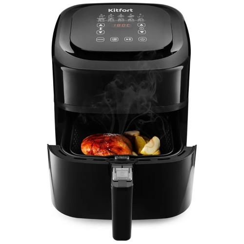 Управление: сенсорное; Встроенные программы приготовления: да; Количество программ: 5; Кнопка отмены приготовления: да; Рабочая поверхность/ёмкость: закрытая; Рабочий/заправочный объём: 4,5; Количество готовых продуктов/блюд за 1 раз: 1; Антипригарное покрытие: да; Съёмная чаша: да; Съёмная крышка: да; Регулировка уровня нагрева: да; Защита корпуса от нагрева: да; Индикация режимов работы: цифровой дисплей; Удобство в использовании: защита от перегрева, автоотключение, таймер, Индикатор работы, Индикация включения; Мощность: 1500; Материал корпуса: пластик; Прочие особенности и свойства: Современный аэрогриль Kitfort КТ-2215 замечателен не только стильным дизайном. Он может использоваться как аэрогриль, а также как аэрофритюрница и духовка, и позволяет готовить большинство продуктов без добавления масла При помощи системы циркуляции горячего воздуха продукты равномерно обжариваются со всех сторон и получаются нежными внутри и с хрустящей корочкой снаружи Аэрогриль оснащен электронным управлением, он имеет 5 автоматических программ. Каждая программа имеет свою температуру приготовления, время готовки задается автоматически исходя из веса продуктов, но время и температуру всегда можно настроить по своему усмотрению На дисплее отображаются температура и время приготовления. Продукты готовятся в специальной корзине, которая вставлена в поддон. И корзина и поддон с антипригарным покрытием. По окончании приготовления аэрогриль автоматически отключается. Поддон с корзиной легко вынимаются и моются Размеры: 31х34.5х40.5 см; Вес: 6,9