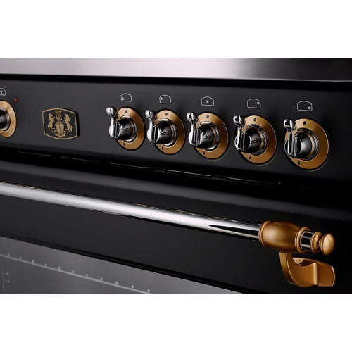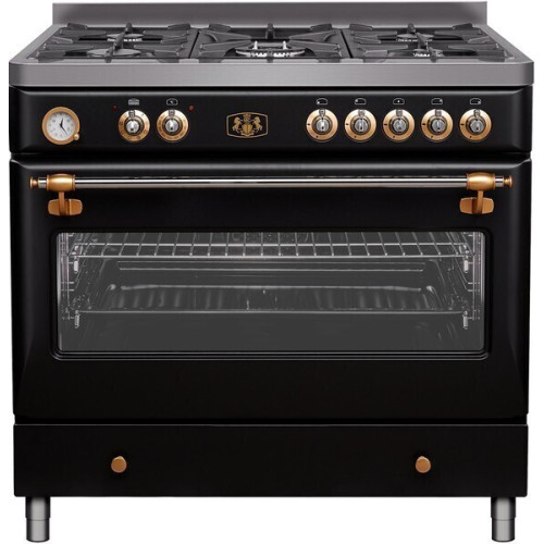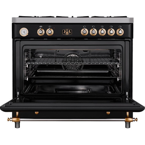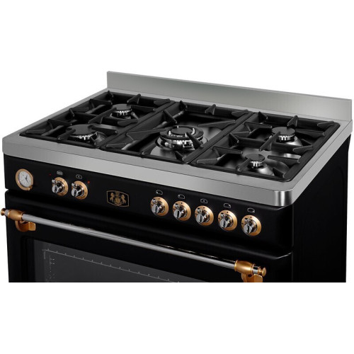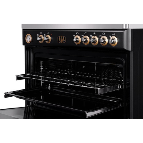 Плита M&G ZBM 3399 ANT — комбинированная модель, выполненная в цвете «антрацит». Газовая варочная поверхность с пятью конфорками, центральная из которых — WOK, оборудована электроподжигом и газ-контролем. Электрическая многофункциональная духовка шириной 90 см оснащена 8 программами для приготовления самых сложных блюд, среди которых Турбо режим, Гриль, Макси гриль, Гриль с конвекцией, Нижний нагрев с конвекцией. Управление производится поворотом переключателей, продолжительность приготовления настраивается при помощи аналогового программатора.