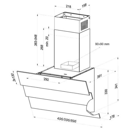На передней панели кухонной вытяжки расположен каскад из 4 белых стёкол в стиле домино. Корпус изделия выполнен из белого крашеного металла. Подъёмное стекло оборудовано газлифтом.