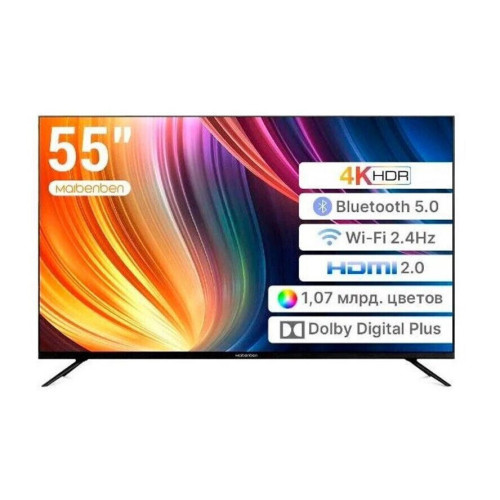 Телевизор Maibenben 55M2UB оснащен экраном диагональю 55 дюймов (139 см), разрешением 3840х2160 пикселей (4K). За счет соотношения сторон 16:9 широкоформатные фильмы транслируются без черных полос. Дисплей выполнен на основе матрицы Direct LED. Технология HDR отвечает за высокую детализацию в темных и светлых сценах. Устройство работает на операционной системе Android, поддерживает функции Smart TV. Модуль Bluetooth отвечает за синхронизацию с мобильными девайсами и пультом, Wi-Fi — за подключение к беспроводному интернету. Для выхода в сеть можно использовать кабельное подсоединение через разъем LAN. Эта модель поддерживает воспроизведение файлов в USB-носителей. Телевизор оборудован акустической системой общей мощностью 50 Вт. В корпус встроены четыре входа HDMI и два порта USB Type-A.