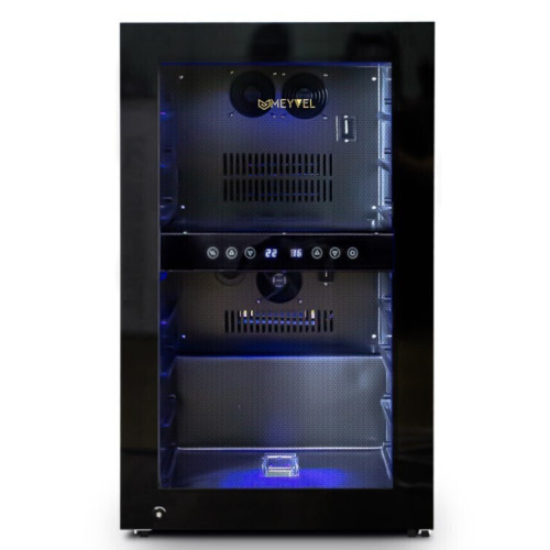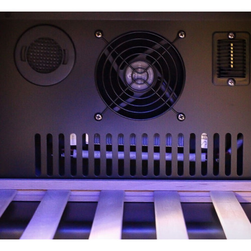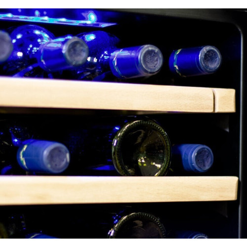 Современный винный шкаф MV45-KBF2 – инновационное решение проблемы качественного хранения вина. Корпус MV45-KBF2 выполнен из стали окрашенной в чёрный цвет, стекло с шелкографией полностью покрывает дверь. Современная технология освещения позволит эффектно продемонстрировать винную коллекцию гостям. Благодаря продуманному внутреннему исполнению и съемным полкам можно бутылки любого объема. Внутреннее пространство рассчитано на хранение до 45 бутылок типа Бордо (0,75 л). Для размещения винных бутылок, шкаф оснащен 7 крепкими полками из массива бука. Модель оснащена многоступенчатой системой гашения вибраций.