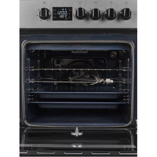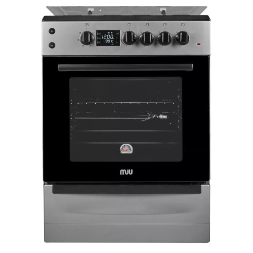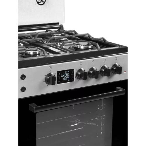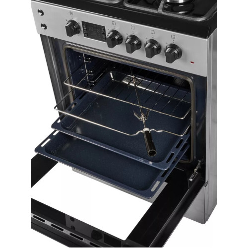 Комбинированная плита выдержана в лаконичном сером цвете, она выглядит стильно, отлично дополнит интерьер кухни. Плита стала обладательницей 4 конфорок с газ-контролем, чтобы предотвратить возможную утечку газа, и с электро-поджигом на ручках для максимального удобства работы с прибором. Электрическая 65-литровая духовка дает широкие возможности для того, чтобы разнообразить свой рацион не только вкусными, но и полезными блюдами – в ней можно готовить блюда на гриле и быть уверенными, что результат превзойдет все ваши самые смелые ожидания. Особенность духовки в использовании конвекции, что способствует более равномерному распределению горячего воздуха по камере, благодаря чему блюда готовятся равномерно. Тщательно контролировать весь процесс позволит термостат. Хромированные направляющие попарно крепятся на боковых стенках внутренней камеры и легко снимаются при необходимости. Благодаря хромированию, противень легче скользит, не повреждая эмаль на стенках. Хромированные направляющие позволяют легко и быстро выдвигать противень и контролировать процесс приготовления. В случае необходимости их можно без труда снять и помыть в посудомоечной машине. Одной из важнейших функций газовой плиты является система газ-контроль. Данная система автоматически прекратит подачу газа, если пламя внезапно потухнет. Также, следует отметить, что стекло духовки является каленным и может выдержать критические температуры. Духовка оснащена функцией гриль и вертелом, которые идеально подойдут для приготовления сочной курочки с хрустящей корочкой. Всего, что вам нужно – лишь нажать кнопку, остальное духовка сделает за вас. В нижней части газовой плиты имеется удобный ящик, в котором Вы можете хранить всю необходимую посуду. Данная модель оснащена звуковым сигналом и автоматическим отключением духовки.