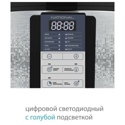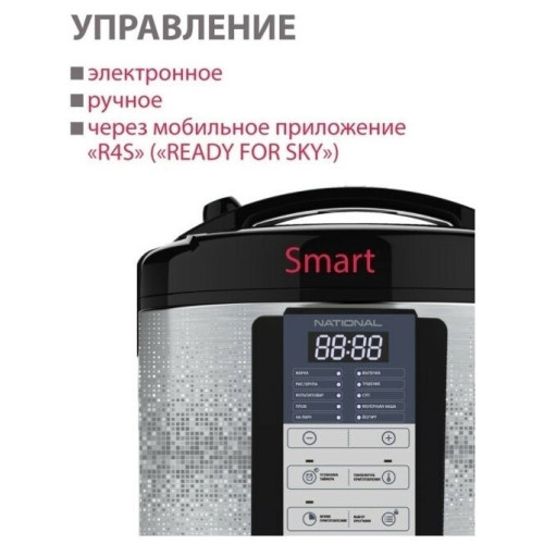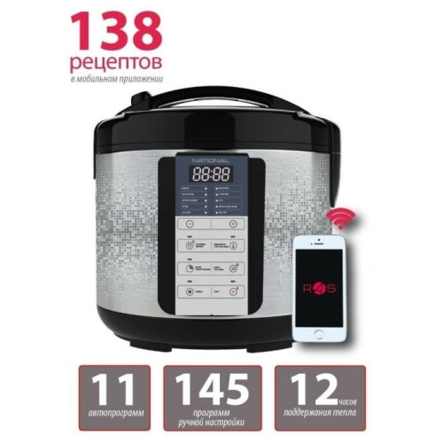 Умная мультиварка National NK-MC10 мощностью 860 Вт c LED-дисплеем, 11 авто программами и 145 программами ручной настройки поможет вам приготовить множество полезных, вкусных и питательных блюд без особых усилий. Благодаря синхронизации с мобильным устройством и приложению R4S (READY FOR SKY) вы сможете приготовить обед или ужин, находясь в соседней комнате и занимаясь другими важными делами. Умная мультиварка National NK-MC10 из серии смарт про с экологичной вместительной алюминиевой чашей объемом 5 л и антипригарным покрытием Daikin имеет 11 авто программ приготовления и 145 программ ручной настройки. На ваш выбор 138 рецептов в бесплатном мобильном приложении READY FOR SKY для дистанционного приготовления с помощью данной мультиварки. Такие технологичные функции, как мульти повар, смартшеф плюс, авто подогрев и его предварительное отключение, разогрев, отложенный старт и функция авто очистки обеспечат максимальный комфорт в повседневном приготовлении блюд любой сложности Технические особенности Мощность устройства 860 Вт Общие характеристики Модель NK-MC10 Гарантийный срок 1 год Питание Питание 220V от сети Управление Управление ручное; Bluetooth; Мобильное приложение Дополнительная информация Покрытие чаши антипригарное DAIKIN Тип мультиварки мультиварка Объем чаши 5 л Количество программ (общее) 145 штук Время отсрочки старта, макс 24 час Программы приготовления мультиповар; выпечка; каши; экспресс; на пару; бульон; Автоматические рецепты; рис; тушение, жарка, суп; крупы, плов, йогурт Доп. опции мультиварки синхронизация с мобильными устройствами; разогрев; подогрев Вес с упаковкой (кг) 3.35 кг Вес без упаковки (кг) 2.9 кг Высота предмета 26 см Глубина предмета 25 см Ширина предмета 25 см Ширина упаковки 29.1 см Высота упаковки 31 см Глубина упаковки 29.2 см Покрытие сковороды антипригарное Страна производства Китай Комплектация инструкция; мультиварка; мерный стакан; контейнер для приготовления на пару; плоская ложка; черпак; гарантийный талон Мультиварка National NK-MC10 (5л, 860Вт, 11/145 программ), Покрытие чаши: антипригарное Daikin; Тип управления: электронное ручное или через мобильное приложение «R4S» («READY FOR SKY»); Дисплей: цифровой светодиодный с голубой подсветкой; Количество автопрограмм: 11; Количество программ ручной настройки: 145; Количество рецептов в мобильном приложении «R4S» 138; Поддержка Bluetooth: 4.0 и выше; Операционные системы: iOS, Android