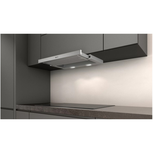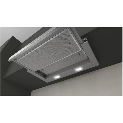 Встраиваемая вытяжка с выдвижным экраном понравится поклонникам обтекаемых кухонь, потому что она незаметно встраивается в нишу верхнего шкафа. Односторонний воздушный поток предотвращает утечку воздуха внутрь, когда вытяжка не используется. Вытяжка оснащена металлическим жироулавливающим фильтром, пригодным для мытья в посудомоечной машине, поверх которого установлена пластина из перфорированной стали. Благодаря встроенному механизму питания телескопическая вытяжка автоматически запускается и останавливается. Выдвижной экран без ручки можно дополнить мебельной или декоративной планкой. LED-освещение даёт яркий свет во время приготовления пищи.