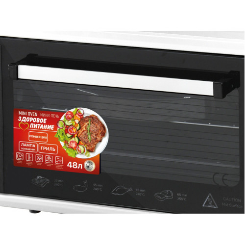 Электрическая духовка OPTIMA OFС-48W представлена в лаконичном дизайне и предназначена для настольной установки. Духовка имеет внушительный объем 48 литров, а высокая мощность 1600Вт делает печь незаменимой для выпечки и запекания мяса, рыбы, а также овощей. Температура варьируется в пределах 50-300 градусов. OPTIMA OFС-48W имеет встроенный таймер с диапазоном до 90 минут, по истечении которых происходит автоматическое отключение прибора, сопровождающееся звуковым сигналом. Это позволяет не следить за процессом приготовления блюда, а посвятить время другим делам. Данная модель оснащена двумя нагревательными элементами, что повышает эффективность и ускоряет процесс готовки. Качественная теплоизоляция корпуса обеспечивает безопасность и исключает вероятность ожога при прикосновении. Важной особенностью данной модели является наличие функции