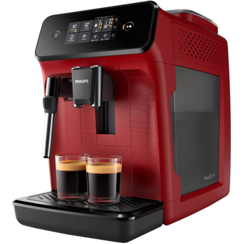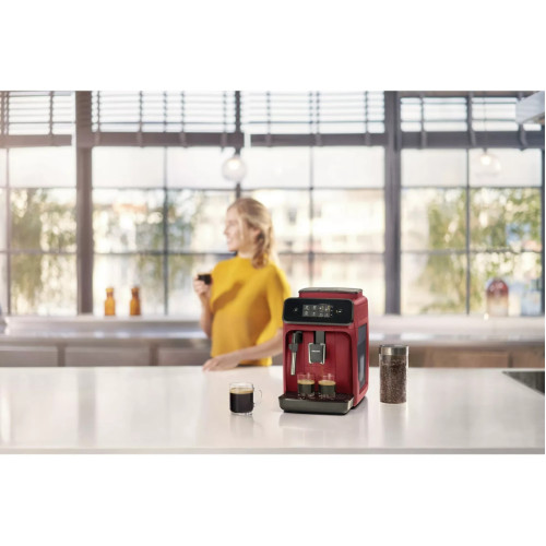 Любой представитель линейки Philips Series 1200 – полностью автоматическая кофемашина. Благодаря ей вы в любой момент получите бодрящий ароматный эспрессо, а специальные насадки позволяют побаловать себя капучино с красивой молочной пенкой. Давление 15 бар обеспечивает отличный вкус и превосходный запах, а 1,8-литровый резервуар освобождает от необходимости часто доливать воду. ПО вашему вкусу Устройство оборудовано встроенной кофемолкой с прочными керамическими жерновами, рассчитанными на длительную эксплуатацию. 12 режимов дают возможность сделать тот порошок, который вам нравится – от сверхмелкого до крупного. просто пользоваться Эта модель оснащена сенсорным дисплеем. Достаточно нескольких лёгких прикосновений, чтобы выбрать тип напитка и задать основные параметры: размер порции воды, температуру и степень крепости.