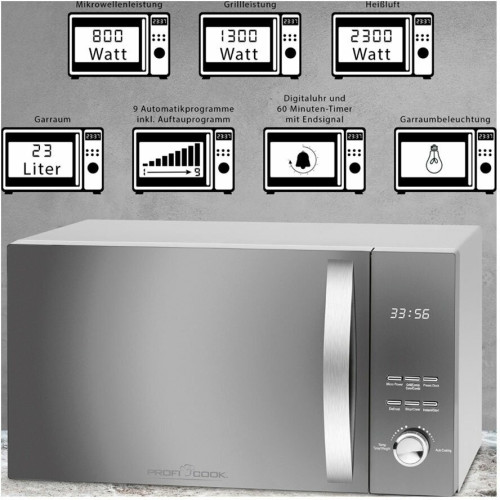 Характеристики: Объём камеры: 23 литра Мощность микроволн: 800 Вт Мощности гриля: 1000 Вт Конвекция: 2300 Вт Камера из нержавеющей стали с подсветкой Передняя часть из зеркального стекла Функция быстрого старта 5 уровней мощности микроволн 7 температурных режимов конвекции 1 уровень гриля 2 комбинированных уровня мощности гриль/микроволновка 2 комбинированных уровня мощности микроволн/горячий воздух 9 автоматических программ, включая программу разморозки Таймер старта до 24 часов Таймер на 60 минут с сигналом окончания Поворотный стол: около 27,0 см Решетка для гриля: около 22,0 см Многофункциональный дисплей с цифровыми часами Блокировка от детей
