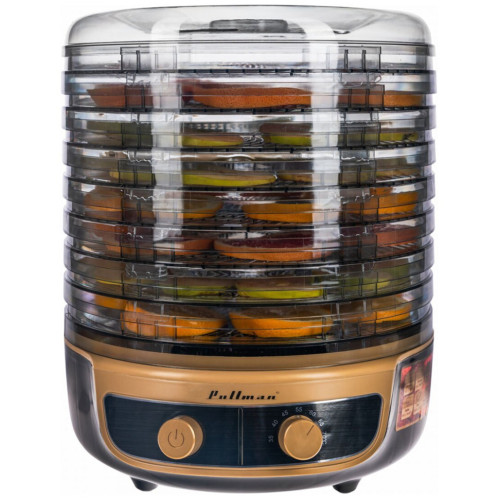 Сушилка для овощей 3в1 Pullman с функциями приготовления йогурта и десертов PL-2280, черно-золотой в каталоге Holodilnik.ru ( в Санкт-Петербурге). Сушилка для овощей Pullman PL-2280 черно-золотистый. Быстрая конвективная сушка. 2 поддона для пастилы. Нагрев от 35 до 75 градусов. Книга рецептов в комплекте! 8 тонированных поддонов (2 из которых со съемной сеткой), что дает возможность устанавливать емкости для приготовления йогурта ( до 9 стеклянных баночек). Сушилка сделана из первичного пищевого пластика, не шумит, имеет терморегулятор. Позволяет сушить фрукты, овощи, грибы, мясо, рыбу, травы, а также делать йогурты и десерты.