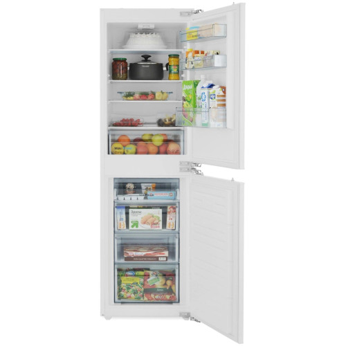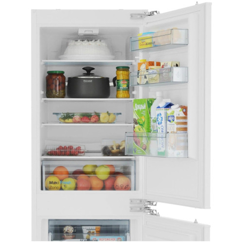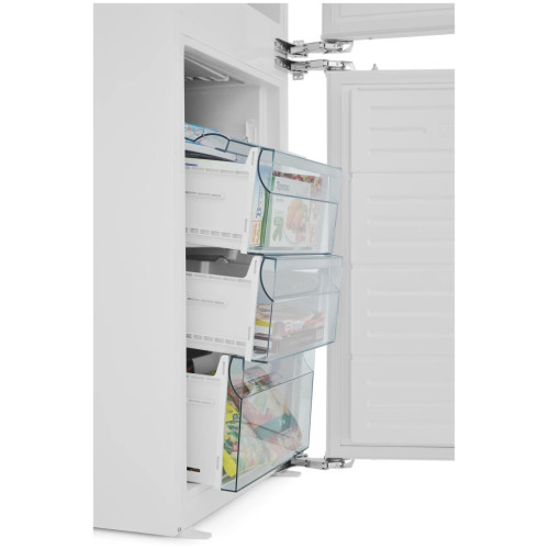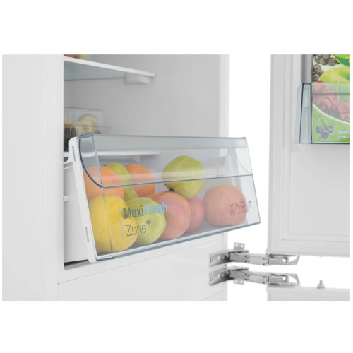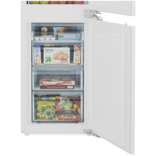 Scandilux CSBI 249 M – это современный встраиваемый двухкамерный холодильник, который сохранит Ваши продукты свежими надолго. Он устанавливается в кухонный шкаф благодаря специальным жестким креплениям для навешивания декоративных панелей. Встраиваемый двухкамерный холодильник Scandilux CSBI 249 M имеет классические габаритные размеры для этого типа техники: внушительный полезный объемом 242 л, достаточный для средней семьи из 3-4 человек. Основное отличие данной модели от многих аналогичных – это разделение размеров высоты холодильной и морозильной камер в пропорции 50/50, что пользуется большой популярностью во многих европейских странах. Во встраиваемом двухкамерном холодильнике Scandilux подобраны и до мелочей продуманы все самые важные и нужные функции: Традиционный электромеханический тип управления прост в обращении. Это придает технике дополнительную надежность, в том числе при возможных колебаниях электроэнергии в сети. Просто установите нужный температурный режим – и наслаждайтесь удобством пользования! В холодильном отделении 4 полки из закаленного стекла в холодильной камере легко перемещаются по высоте и выдерживают большой вес. 3 полки на двери предназначены для дополнительного размещения продуктов. На одну из них можно установить лоток для яиц, , который входит в комплектацию.