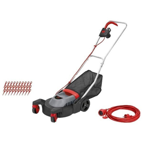 колесная газонокосилка электрический двигатель от сетевого кабеля ширина / высота скашивания: 29 см / 25-55 мм площадь скашивания: 50 м² выброс травы в мягкий травосборник , назад вес: 4.3 кг уровень шума 84 дБ