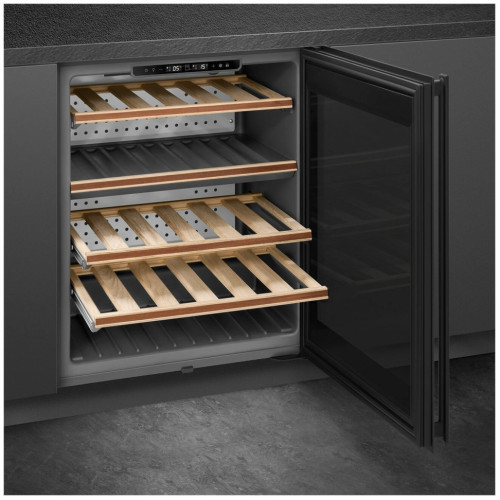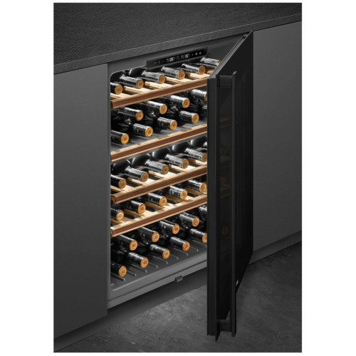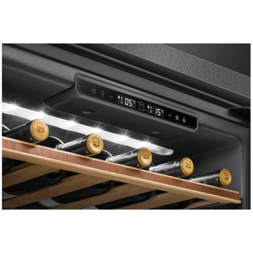 Общие данные: Размеры: высота: 82.5 см ширина: 59.5 см глубина: 56.6 см Полезный объем: 114 л Максимальное количество бутылок: 38 Тип управления: электронный Климатический класс: SN-ST (от 10С до 38С) Класс энергоэффективности: G Годовое потребление энергии: 140 кВтч Цвет: черный Полки: 3 деревянные регулируемые 2 фиксированные Выдвижные полки на телескопических направляющих Количество температурных зон: 2 Температурный диапазон: от 5С до 20С Тип системы охлаждения: компрессорное Автоматическое