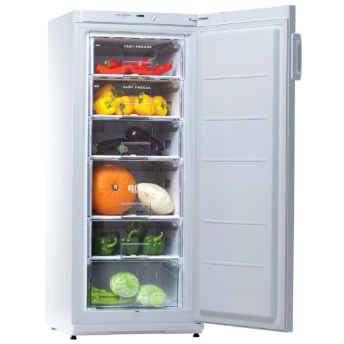 Морозильник оснащен 6 выдвижными ящиками, имеет класс энергопотребления: А+ Температуру в морозильнике можно регулировать механическим рычажком, имеет 7 температурных режимов. Имеется индикация аварийной работы холодильника, и система антибактериальной защиты. Хладагент: R600a