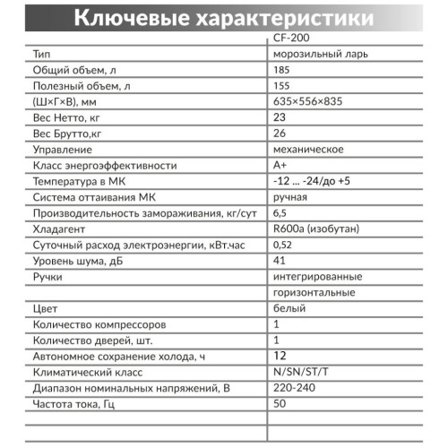 тип морозильника: ларь, размораживание: ручное, общий объем: 185 л, высота: 83.50 см, ширина: 63.50 см, глубина: 55.60 см, класс энергопотребления: A+, климатический класс: N, SN, ST, T, N-T +16°C / +43°C, количество ящиков/полок: 1, цвет корпуса: белый, минимальная температура в морозильной камере: -24, количество камер: 1, тип управления: электромеханическое, мощность замораживания: 6.50 кг/сут, уровень шума: 41 дБ