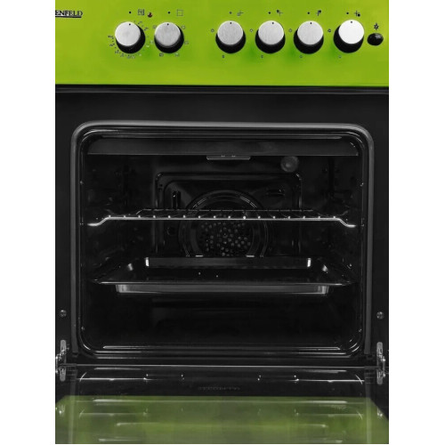Комбинированная плита оснащена 4 газовыми конфорками и электрической духовкой на 60 л. Эмалированная панель легко очищается от капель жира и остатков пищи. Варочная поверхность дополнена крышкой, которая закрывает все 4 конфорки. Плита оснащена термостатом и простыми поворотными переключателями с кнопкой электроподжига. Духовой шкаф дополняется яркой подсветкой, противнем и решеткой.