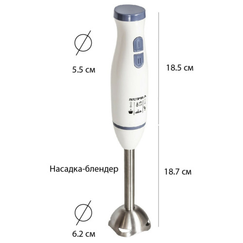 Погружной блендер Supra HBS-694 позволит каждой хозяйке готовить с удовольствием. Устройство обеспечивает быстрый результат и отличное качество приготовления благодаря мощному мотору на 700 Вт. Выполняет функцию смешивания и измельчения качественно и без брызг. * Имеет 2 скоростных режима. * Корпус выполнен из прочного пластика, а погружная часть - из нержавеющей стали. * В комплектацию входят блендер, гарантийный талон и инструкция на русском языке. * Цвет прибора - белый с серым. Эргономичная форма ручки создана для комфортной работы. Прибор отличается компактными размерами, он легко поместится в маленьком кухонном ящике и не займет много места на полке шкафчика. Допускается мытье его частей в посудомоечной машине.