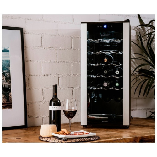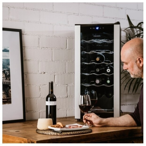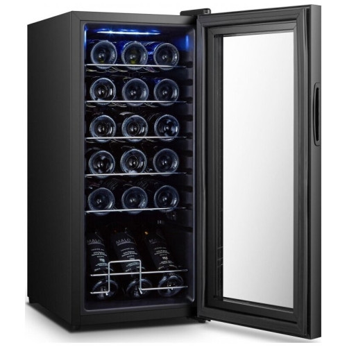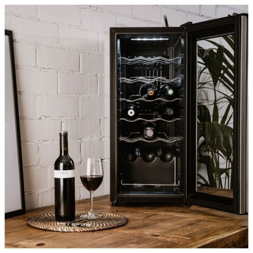 тип винного шкафа: монотемпературный, высота: 77 см, ширина: 34.50 см, глубина: 45 см, емкость винного шкафа, бут.: 18, количество камер: 1, класс энергопотребления: G, цвет корпуса: чёрный