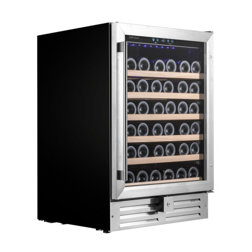 Винный шкаф серии Premium с фасадом из черного стекла в раме вместимостью 46 бутылок и одной температурной зоной (5-20° C). Выдвижные полки из массива дерева(бук) обеспечивают хороший обзор винной коллекции. Сенсорная панель управления с индикатором температуры.