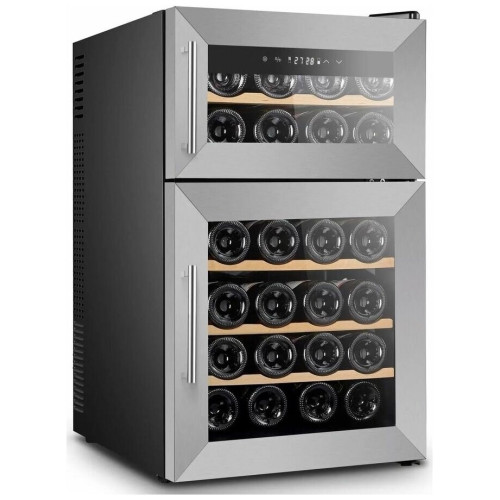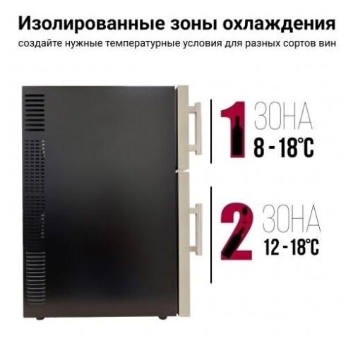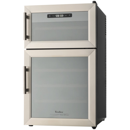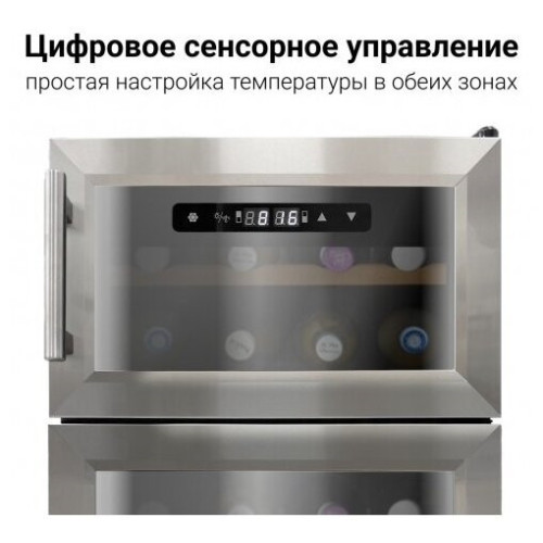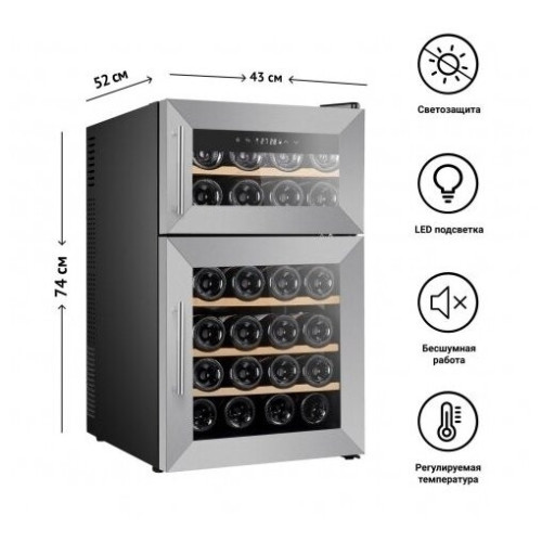 Винный шкаф Tesler WCD-242 позаботится о том, чтобы аромат и качество благородных напитков со временем становились только лучше. Постоянная циркуляция прохладного воздуха внутри поможет хранить любые сорта вин – просто настройте нужную температуру в каждом отделении. Красное, белое, розе или игристое — вы всегда будете уверены, что любимый напиток находится в должных условиях. Внутренняя температура в верхней зоне регулируется в диапазоне от 8 до 18°C, в нижней – от 12°C до 18°C. Внутри шкафа можно разместить 24 бутылки, что идеально подойдёт ценителям вин, собирающим коллекцию для длительного хранения. Зеркальная дверца из двухслойного закаленного стекла защитит вина от света. При этом вы сможете увидеть содержимое шкафа, не открывая дверцу. Для этого достаточно просто включить подсветку с помощью сенсорного дисплея. Панель управления с LED дисплеем и сенсорным управлением автоматически блокируется через 12 секунд после последнего нажатия. Термоэлектрическая система охлаждения - это низкий уровень шума, отсутствие вибраций и возможность размещения практически в любом помещении. Ножки шкафа регулируются по высоте, что позволяет с удобством установить его на любой поверхности. Благодаря строгому и одновременно элегантному дизайну винный шкаф Tesler легко впишется в интерьер городской квартиры, загородного дома или офиса.