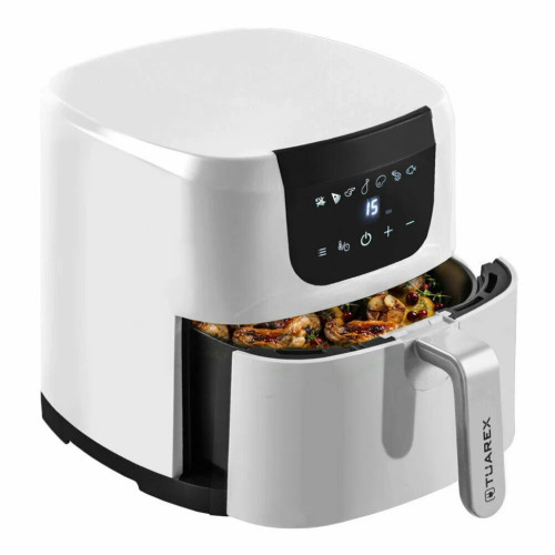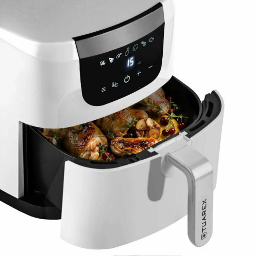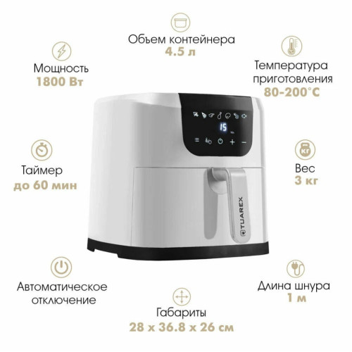 Аэрогриль Tuarex AG-3002 предназначен для приготовления блюд с эффектом фритюра и гриля. Данная модель обеспечивает равномерную прожарку и делает блюда вкусными и с хрустящей корочкой. Блюда получаются золотистыми и сочными. С помощью технологии циркуляции горячего воздуха, в аэрогриле осуществляется горячий обдув воздуха со всех сторон и позволяет готовить блюда гораздо быстрее и с минимум добавления масла. Модель имеет 7 автоматических программ, разработанные специально под конкретные блюда, поэтому Вам не придется контролировать процесс приготовления самостоятельно. С помощью данных программ, Вы сможете приготовить такие блюда как картофель фри, пиццу, куриные крылышки, куриные ножки, стейки, креветки и рыбу. Аэрофритюрница AG-3002 обладает мощностью 1800 Вт и чашей с антипригарным покрытием 4, 5 литра, и позволяет с удобством готовить и небольшие порции для одного человека, и полноценные блюда для всей семьи. Благодаря антипригарному покрытию, продукты не будут прилипать во время приготовления, и вы также легко сможете очистить чашу после готовки. Приятной особенностью аэрогриля является то, что вы можете использовать его и для подогрева Ваших блюд. Безопасность использования обеспечивают такие функции, как защита от перегрева, автоматическое отключение и индикатор работы.