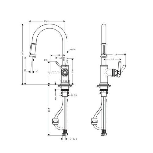 AXOR Montreux 16581140 - Однорычажный смеситель для кухни с вытяжным изливом: угол поворота излива c регулировкой на 2 уровня (110°, 150°), вертикальное расположение рукоятки, обычная (ламинарная) струя + с переключением на душевую струю, переключение струи в исходное положение нажатием кнопки, магнитная система крепления душа MagFit, душевой шланг Quick-Connect, расход воды 9,5 л / мин, керамический картридж, гибкий подвод воды ⅜ дюйма, подходит для проточных водонагревателей.