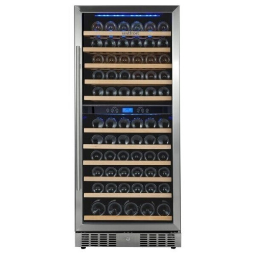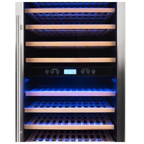 * Тип: отдельно стоящий. * Возможность встраивания: есть. * Объём: 347 л. * Класс энергопотребления: С. * Мощность: 230 Вт. * Хладагент: R600a. * Уровень шума: 39 дБ. * Количество компрессоров: 1. * Количество деревянных полок: 11. * Количество температурных зон: 2. * Количество бутылок: 102. * Диапазон температур: 5~18 °C (верхняя зона), 10~18 °C (нижняя зона). * LCD-дисплей: есть. * Управление: сенсорное. * Подсветка: есть. * Цвет подсветки: голубой. * Система размораживания: NO FROST. * Дверь из закалённого стекла: есть. * Окантовка двери: нержавеющая сталь. * Габариты (Ш × В × Г): 595 × 1430 × 680 мм. * Вес: 82,8 кг.