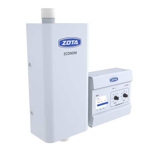 Электрический настенный котел Zota Econom – отличное решение для обеспечения эффективного и экономичного отопления в доме или в качестве резервного котла. Основные преимущества: * котел c пультом управления на электомагнитых реле ПУ ЭВТ И.1 * блок управления и нагревательные элементы размещены в отдельных корпусах; * блоки ТЭН из нержавеющей трубки диаметром 7,4 мм специальной конструкции с пониженной ваттной нагрузкой (возможна замена с помощью обычного ключа); * автоматическое регулирование температуры воздуха в помещении от +10 до +35 °С и теплоносителя на выходе из котла от +30 до +90 °С ; * система самодиагностики неисправностей; * возможно подключение внешнего хронотермостата; * может использоваться для нагрева воды для технических целей через бак косвенного нагрева.