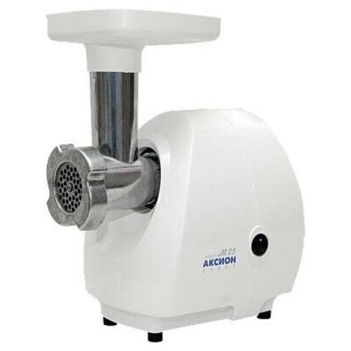 Мясорубка Аксион М 25.01 оснащена белым пластиковым корпусом и отличается стильным обтекаемым дизайном. Предусматривается простая конструкция, удобная очистка всех деталей после эксплуатации и оперативная сборка. Вес модели равен 5 кг, габариты составляют 17x32x26 см. Имеются прорезиненные ножки, гарантирующие устойчивость оборудования и защищающие от вибраций при эксплуатации. Мощность двигателя достигает 1500 Вт, что позволяет работать с производительностью до 1700 г/мин. Непрерывная работа может продолжаться до 15 минут, поскольку Аксион М 25.01 не имеет дополнительной защиты от перегрева. Модель оснащена пластиковым лотком. Предусматривается наличие 2 перфорированных дисков для фарша. Насадок в комплекте к данной модели не имеется. Длина сетевого шнура равна 1,2 м. В корпусе имеется удобный отсек для хранения шнура, что упрощает транспортировку мясорубки.