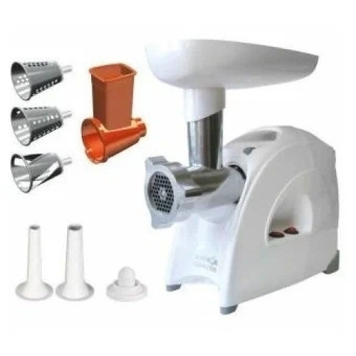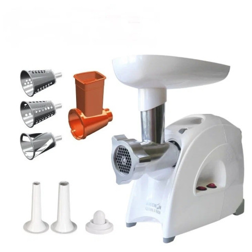 Максимальная мощность - 2000 Вт Производительность – до 3 кг/мин. В комплекте: приставка для набивки колбас; кеббе; овощерезка; нож с саблевидной режущей кромкой из нержавеющей стали; 2 решетки увеличенной толщины из нержавеющей стали с отверстиями ? 4,9 мм и 8,5 мм; 1 запасной металлический колпачок. Преимущества: • Двойная защита двигателя от перегрузки • Функция «реверс» для предотвращения наматывания жилок на шнек • Увеличенное время непрерывной работы – 30 минут • Отсек в корпусе для шнура питания, хранения решеток • Эргономичная гайка для удобной сборки/разборки мясорубки • Возможность вертикального хранения для экономии пространства • Новая конусообразная конструкция овощерезки
