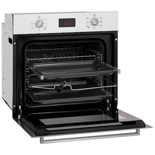 Встраиваемый электрический духовой шкаф AVEX HM 6172 W сочетает в себе высокую функциональность и современный дизайн, поэтому определенно станет настоящим украшением любой кухни! Духовой шкаф, общим объемом 56 л, имеет 7 режимов нагрева, сенсорный дисплей и электронный таймер, который настраивается до 180 минут и обеспечивает работу духовки на протяжении установленного времени. Духовой шкаф отключается и издает звуковой сигнал по истечению заданного времени готовки. Кольцевой нагревательный элемент, расположенный на задней стенке внутри камеры, способствует равномерному распространению жара по всему пространству духовки. Максимальная температура нагревания 250оC. Механическое управление с серебристыми утапливаемыми ручками позволяет выбрать оптимальный режим нагрева и настроить температуру. Такой механизм ручек также выступает в роли защиты от детей. Кроме стандартных режимов нагрева и конвекции, в духовки есть такие функции, как «Гриль», «Сильный гриль + Конвекция», а также «Гриль + вращение курицы» на вертеле. С этими функциями легко приготовить мясо, рыбу или овощи с румяной корочкой. Модель оборудована 5-ти уровневыми хромированными направляющими и телескопическими направляющими (1 уровень), которые позволяют легко выдвигать противень и решетки за пределы духовки. В комплекте идут решетка, противень глубокий и стандартный. Духовой шкаф AVEX HM 6172 W оснащен функцией самоочистки. Каталитические пластины внутри духового шкафа расщепляют жир и загрязнения во время приготовления при температуре от 150 градусов. Это обеспечивает легкий уход за внутренним покрытием. Дверца духовки выполнена из двойного закаленного стекла, оно отличается жароустойчивостью и надежностью в эксплуатации. Кроме того, встроенная система тангенциального охлаждения дверцы позволяет защитить ее не только от перегрева, но и кухонную мебель, в которую встроен духовой шкаф. Модель выполнена в цвете «белое стекло». Стильный, технологичный и надежный духовой шкаф AVEX HM 6172 W – оптимальное решение для Вашей кухни!