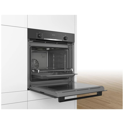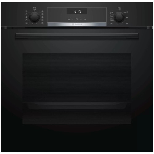 Электрический духовой шкаф Bosch Serie 6 обладает увеличенным объемом камеры – 71 л. Это указывает на возможность готовить внутри крупные куски мяса, например, индейку или окорок. Также необходимо отметить встроенный гриль, с использованием которого также можно делать всевозможные нестандартные блюда. За счет конвекционного вентилятора горячий (до 275°) воздух внутри перемещается равномерно. Благодаря наличию 10 встроенных автоматических программ приготовления разобраться в приготовлении пищи не составит труда. Откидная дверца модели обладает механизмом плавного закрывания, благодаря чему она не разобьется. Еще одно достоинство электрического духового шкафа Bosch Serie 6 заключается в том, что он обладает высокой степенью безопасности использования за счет блокировки от детей и опции автоотключения. Внутри камеры предусмотрены телескопические направляющие. Опция самоочистки EcoClean максимально упрощает уход за духовым шкафом изнутри.