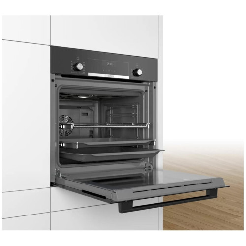 Электрический духовой шкаф Bosch Serie | 6 hbj517fb0r легко встраивается в кухню и не занимает много места. Функция 3D-горячий воздух обеспечивает великолепные результаты выпечки и жарки на трех уровнях одновременно, поэтому вам не придется ждать, пока приготовится одно блюдо, чтобы поставить следующее. Имеется опция быстрого разогрева, а таймер вовремя выключит огонь, даже если вы будете в другой комнате. Продуманная конструкция делает использование модели максимально комфортным. Благодаря телескопическим направляющим противней обеспечивается удобный и безопасный доступ к деликатесу на нужном уровне. Специальный амортизатор плавно закрывает дверь без лишнего шума и увеличивает срок службы техники.