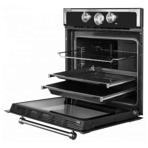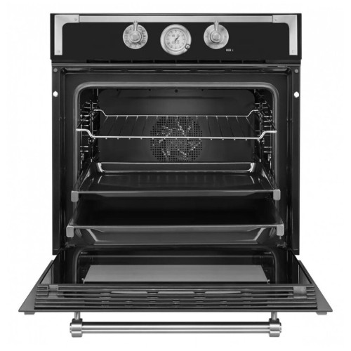 Аутентичный таймер Таймер, стилизованный под старинные часы с римским циферблатом, станет оригинальным украшением классического интерьера кухни. металлическая фурнитура Фурнитура духового шкафа выполнена из прочного металла с применением ручной обработки. При изготовлении каждой детали применяется индивидуальный подход, поэтому гарантируются такие свойства: высокий уровень качества; надежность и прочность; долгий срок службы. Эстетичный дизайн элементов из металла подчеркивает изысканность духового шкафа и создает особенный антураж всего кухонного помещения разморозка Программа разморозки духового шкафа быстро и эффективно подготовит замороженные полуфабрикаты к приготовлению. Благодаря данной полезной функции, больше не понадобится размораживать продукты при комнатной температуре или в холодильном отсеке быстрый нагрев Функция быстрого нагрева, сокращает время необходимое для поднятия температуры до нужного уровня. Каждый раз используя духовой шкаф вы будете экономить свое время избегая долго ожидания прогрева камеры духовки. турборежим Главная особенность турборежима состоит в равномерном нагревании всего объема духовки на разных уровнях. Приготовление блюд может производиться без необходимости их передвигать или переворачивать. Объясняется это тем, что горячий воздух поднимается от центрального нагревателя и распределяется по всей камере с одинаковой интенсивностью. камера 70 литров Внутренняя камера духовки объемом 70 литров позволит разместить как большие блюда целиком, так и установить много маленьких форм для запекания на разных уровнях. Основные достоинства камеры духовки: отсутствие швов; нет стыков, в которых скапливается грязь; простота процесса очистки камеры. съемная И полностью разборная дверь Для проведения тотального очищения духового шкафа, следует предпринять ряд простых шагов: без приложения особых усилий снять дверцу; вытащить стекла; тщательно промыть все укромные уголки прибора. По окончании, с той же легкостью, следует собрать конструкцию и установить ее обратно без применения специальных инструментов двухуровневые телескопические направляющие Наличие съемных телескопических двухуровневых направляющих обеспечивает удобство и эффективность работы с духовым шкафом. Основные преимущества: выдвижной механизм; плавный и мягкий ход полозьев; надежная установка; наличие упоров, блокирующих выпадение противня; сведение к минимуму риска термических ожогов. доводчик двери Духовой шкаф оснащен современными и надежными петлями с автоматическим доводчиком дверцы. охлаждение дверцы 3 стекла Дверца духового шкафа не нагревается, благодаря инновационной технологии охлаждения.