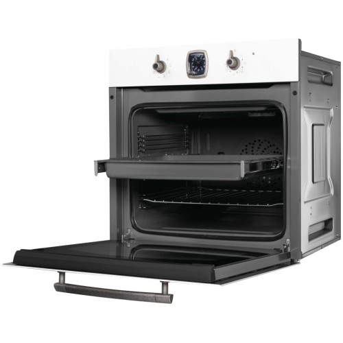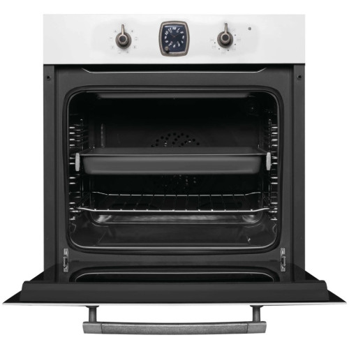 Классический дизайн - это аксессуары, ручки дверцы и другие элементы, выполненные под бронзу, задача которых создать идеальное сочетание с натуральными материалами и фурнитурой кухонной мебели в классическом или ретро стиле. Часы в ретро стиле Внешний вид часов, расположенных на панели управления выполнен в классическом, традиционном стиле. Не смотря на то, что каждый элемент часов от стрелок до цифр выглядит как и много лет назад, внутри скрывается современный электронный таймер, который подаст акустический сигнал по истечению заданного времени. Электронный таймер Электронный таймер поможет установить время продолжительности приготовления, после которого духовой шкаф остановит свою работу, время отложенного старта, который включит духовой шкаф в необходимый момент и самостоятельно отключит его по истечению заданного времени, и акустический сигнал, который подается по истечению заданного времени даже, если духовой шкаф не находится в режиме приготовления. 8 режимов нагрева Восемь режимов нагрева, включающие работу классических нагревательных элементов, кольцевого нагревателя в сочетании с конвектором, позволяют готовить самые сложные и необычные блюда. Телескопические направляющие Телескопические направляющие надежно удерживают противень в духовке, что дает больше безопасности и комфорта – противень не нужно удерживать в руках, чтобы проверить качество приготовления блюд. Каталитическая самоочистка На задней стенке духовки установлена металлическая пластина со специальным самоочищающимся покрытием, расщепляющая загрязнения, когда камера прогревается до 200°С. Каталитическая панель облегчает процесс очистки духовки от загрязнений. Тройное остекление дверцы Конструкция дверцы с применением трех стекол позволяет снизить температуру фронтальной поверхности до минимума. Помимо этого стекла обладают свойствами защитного экрана, удерживающего тепло внутри камеры. Все это снижает потребление электроэнергии и делает приготовление полностью безопасным. Освещаемая камера духового шкафа Лампа освещения включается автоматически при выборе режима приготовления. Очень удобно следить за процессом приготовления, не открывая дверцу и не выпуская тепло из рабочей камеры. Автоматическое отключение Специальный защитный элемент автоматически отключает духовой шкаф в случае, если пользователь забыл это сделать сам. Время экстренного отключения зависит от ранее выбранной температуры. Можно быть полностью уверенным в безопасности для мебели.