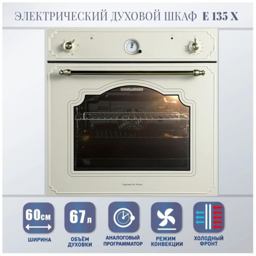 Духовой шкаф Zigmund Shtain E 135 X, в бежевом цвете, органично впишется в Вашу кухню ретро-стиля. несколько режимов нагрева и освещение позволят Вам приготовить практически любое блюдо, аналоговой программатор поможет Вам установить время работы духовки с последующим отключением. Электрическая духовка Зигмунд Штайн E 135 X имеет тангенциальное охлаждение и холодный фронт, что сделает пользование духовкой безопасным. Еще больше удобства за безопасным контролем готовки блюд дают телескопические направляющие, так как они позволяют противням выдвигаться равномерно, добавляя безопасность при проверке качества приготовления еды или ее извлечении. С телескопическими направляющими не нужно удерживать противни на весу. Металлическая ручка дверцы и ручки управления.