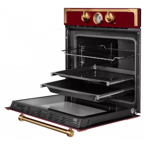 Аутентичный таймер Таймер, стилизованный под старинные часы с римским циферблатом, станет оригинальным украшением классического интерьера кухни. металлическая фурнитура Фурнитура духового шкафа выполнена из прочного металла с применением ручной обработки. При изготовлении каждой детали применяется индивидуальный подход, поэтому гарантируются такие свойства: высокий уровень качества; надежность и прочность; долгий срок службы. Эстетичный дизайн элементов из металла подчеркивает изысканность духового шкафа и создает особенный антураж всего кухонного помещения разморозка Программа разморозки духового шкафа быстро и эффективно подготовит замороженные полуфабрикаты к приготовлению. Благодаря данной полезной функции, больше не понадобится размораживать продукты при комнатной температуре или в холодильном отсеке быстрый нагрев Функция быстрого нагрева, сокращает время необходимое для поднятия температуры до нужного уровня. Каждый раз используя духовой шкаф вы будете экономить свое время избегая долго ожидания прогрева камеры духовки. турборежим Главная особенность турборежима состоит в равномерном нагревании всего объема духовки на разных уровнях. Приготовление блюд может производиться без необходимости их передвигать или переворачивать. Объясняется это тем, что горячий воздух поднимается от центрального нагревателя и распределяется по всей камере с одинаковой интенсивностью. камера 70 литров Внутренняя камера духовки объемом 70 литров позволит разместить как большие блюда целиком, так и установить много маленьких форм для запекания на разных уровнях. Основные достоинства камеры духовки: отсутствие швов; нет стыков, в которых скапливается грязь; простота процесса очистки камеры. съемная И полностью разборная дверь Для проведения тотального очищения духового шкафа, следует предпринять ряд простых шагов: без приложения особых усилий снять дверцу; вытащить стекла; тщательно промыть все укромные уголки прибора. По окончании, с той же легкостью, следует собрать конструкцию и установить ее обратно без применения специальных инструментов двухуровневые телескопические направляющие Наличие съемных телескопических двухуровневых направляющих обеспечивает удобство и эффективность работы с духовым шкафом. Основные преимущества: выдвижной механизм; плавный и мягкий ход полозьев; надежная установка; наличие упоров, блокирующих выпадение противня; сведение к минимуму риска термических ожогов. доводчик двери Духовой шкаф оснащен современными и надежными петлями с автоматическим доводчиком дверцы. охлаждение дверцы 3 стекла Дверца духового шкафа не нагревается, благодаря инновационной технологии охлаждения.
